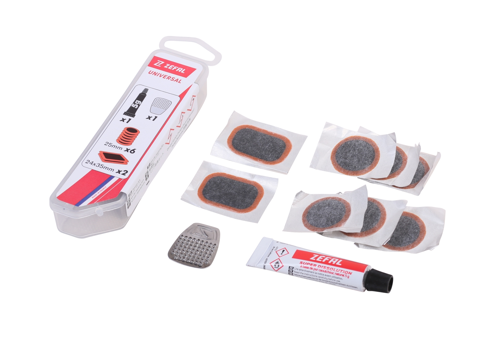 Kit Zefal UNIVERSAL per riparazione camere d’aria, contiene: 8 rappezzi (6 da Ø 25 mm, 2 da 24×35 mm) / 1 tubetto di mastice da 5 g. / 1 grattugia in acciaio inox.