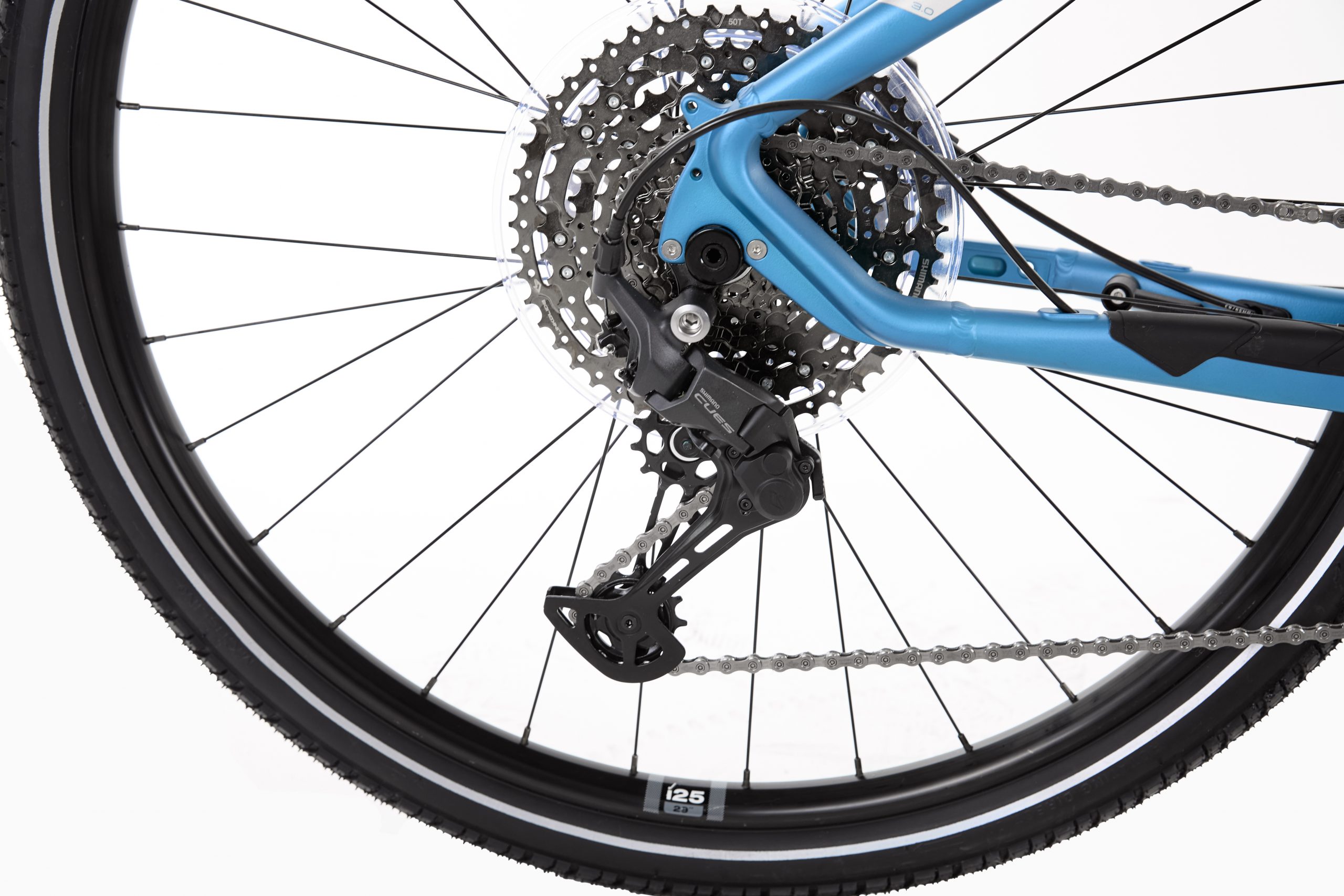 Il sistema di trasmissione Shimano Cues 1×11 garantisce cambi precisi e adatti a diversi tipi di terreno, mentre l’ammortizzatore RockShox Judy AIR (80 mm) assicura comfort su superfici irregolari.