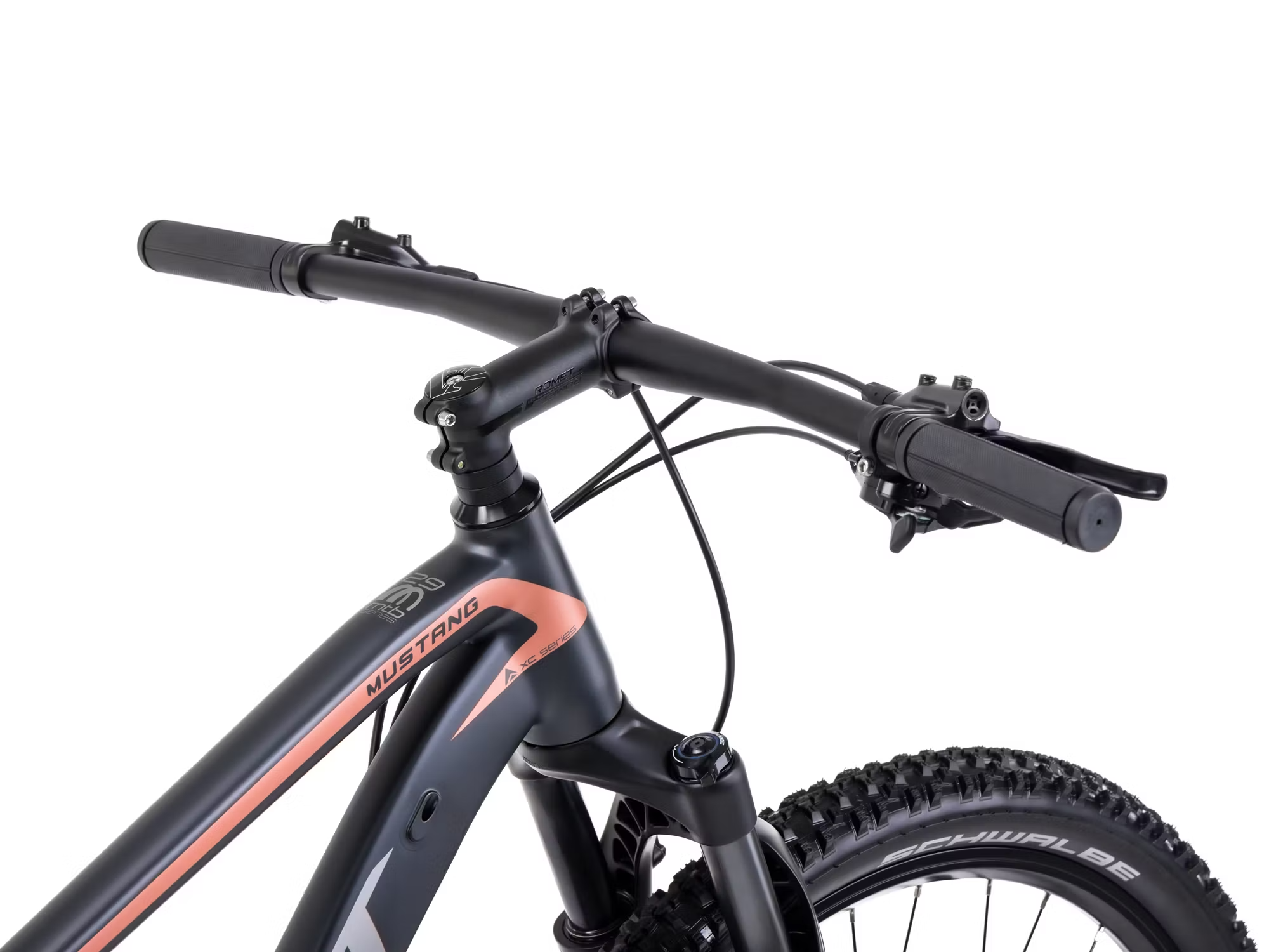 I freni a disco Shimano a doppio pistoncino offrono sicurezza totale, mentre il set di ruote in alluminio con pneumatici Schwalbe assicura stabilità e maneggevolezza anche sui percorsi più tecnici.
