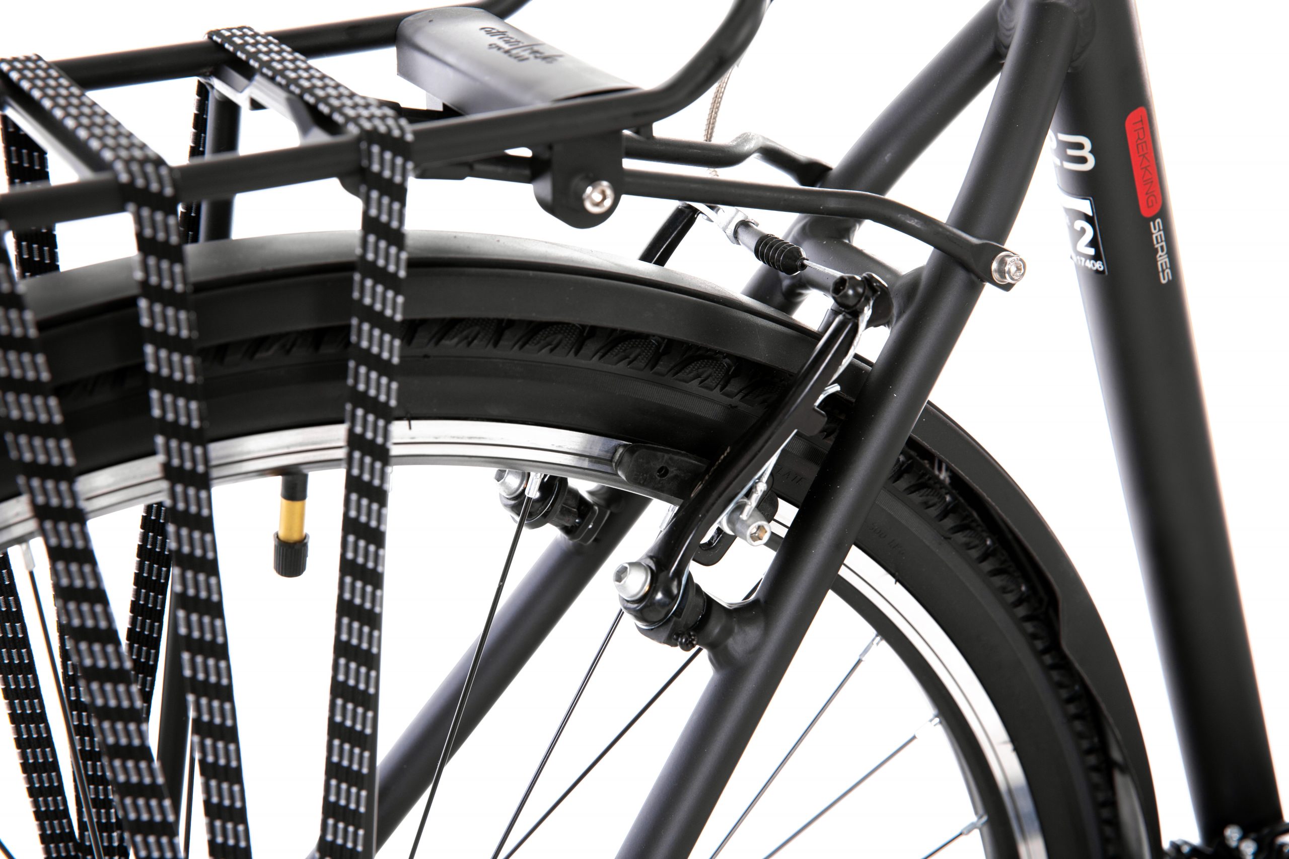Il modello è dotato di forcella ammortizzata anteriore, trasmissione Shimano a 21 velocità, freni a V affidabili e ruote da 28 pollici, garantendo comfort e fluidità di guida.